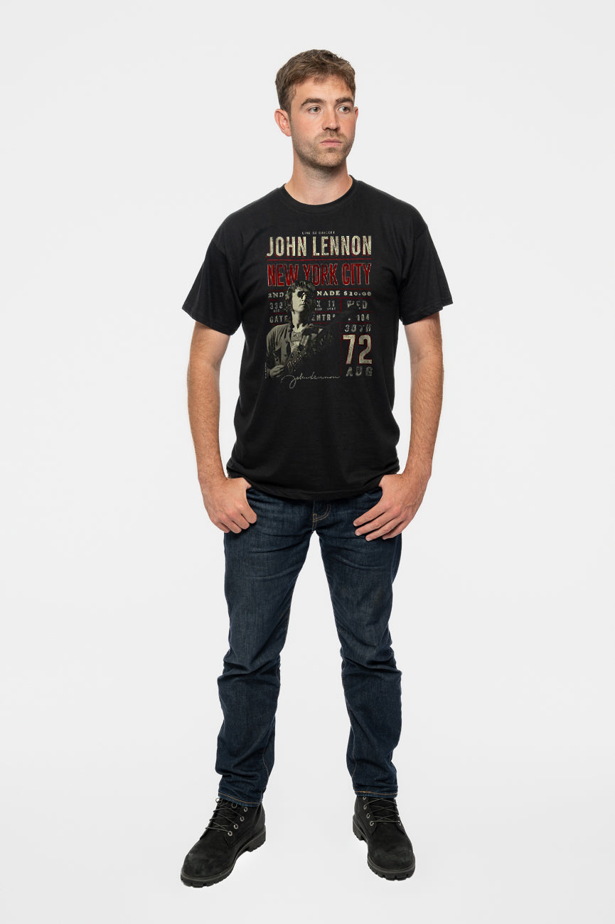 An official licensed John Lennon Unisex T-Shirt featuring the 'NYC '72' design motif. This high quality T-Shirt is available in a black colourway. Comes in a wide range of sizes from Small through XX-Large, subject to availability.