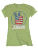 An official licensed John Lennon Ladies Tee featuring the 'Peace Fingers US Flag' design motif. This high quality t-shirt design is available in the kiwi green colourway. Classic fit tee in soft-style cotton with crew neck. Available in a wide range of sizes from small through to XX-large dependent on availability.