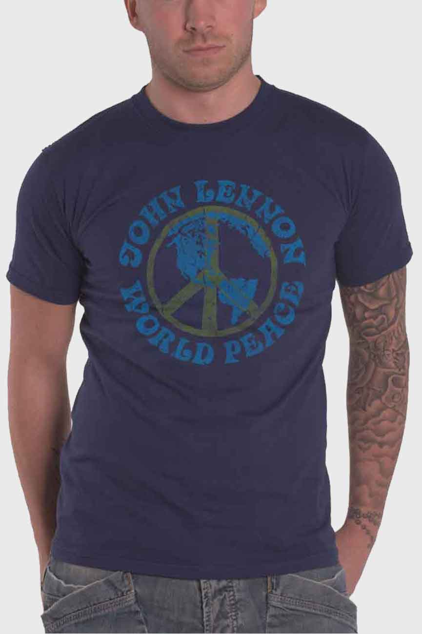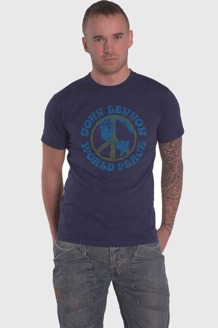 An official licensed John Lennon tshirt featuring the 'World Peace' design motif. This high quality tshirt is available in a navy blue colourway. A high quality fit soft-style cotton tee with short sleeves and crew neck. Comes in a wide range of sizes from Small through XX-Large, subject to availability.