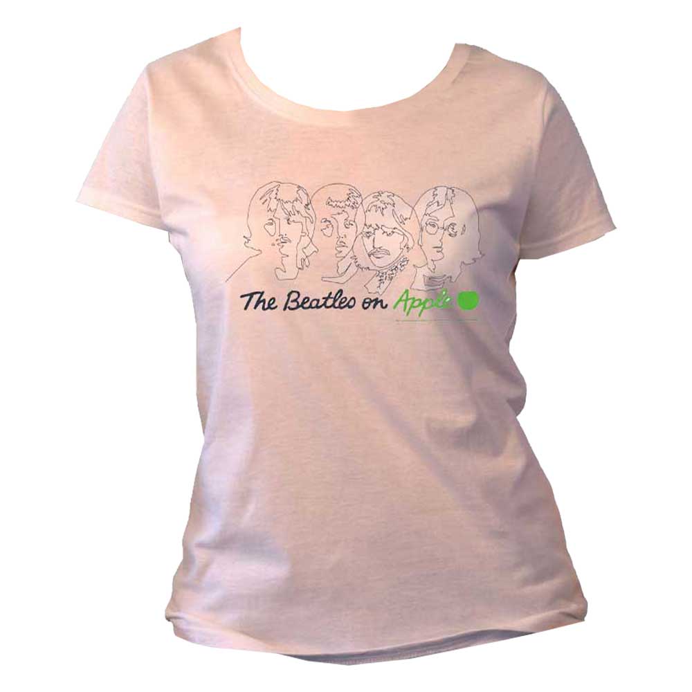An official licensed ladies Cotton Premium Tee featuring The Beatles 'On Apple' design motif. This high quality t-shirt is available in a white colourway. We offer a range of sizes from Small through X-Large, subject to stock availability.