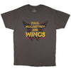 An officially licensed Paul McCartney T-shirt featuring the Wings Over America �76 design motif. Manufactured from soft-style cotton, this unisex short-sleeve tee features a classic crew neckline. Finished in a charcoal grey blank, the front-printed design references the Wings Over America tour from 1976. Supplied bagged for retail distribution. Comes in a wide range of sizes from Small through XX-Large, subject to availability.