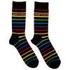 Official licensed Pink Floyd Unisex Ankle Socks featuring the 'Prism Stripes' design motif. These high quality Ankle Socks are available in a black colourway. These premium quality, colourful, all-over pattern cotton rich woven socks are guaranteed to stand out in the crowd.