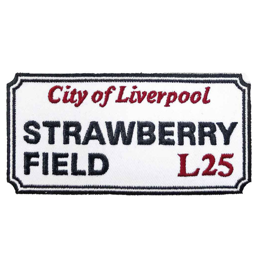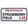 Official licensed Road Sign Standard Woven Patch featuring the 'Strawberry Field Liverpool Sign' design motif. High quality polyester Standard Woven Patch featuring a woven design motif and overlocked edge. Designed to iron onto a garment.