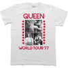 Official licensed Queen Unisex T-Shirt featuring the 'World Tour 77' design motif. High quality white unisex t-shirt featuring front printed design motif. Comes in a wide range of sizes from Small through XX-Large, subject to availability.