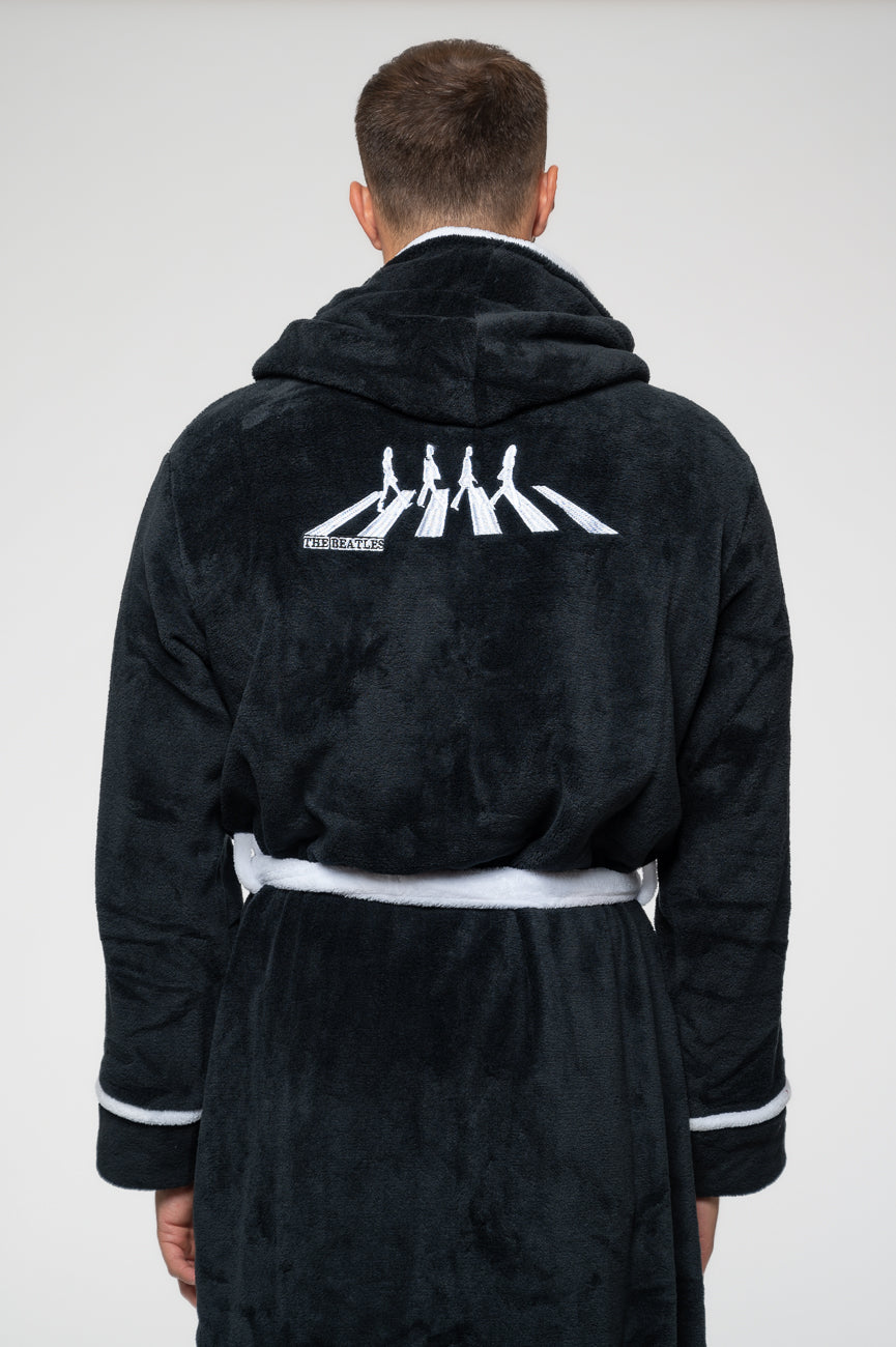 An official licensed The Beatles Unisex Bathrobe featuring the 'Abbey Road' design motif. This high quality Bathrobe is available in a black & white colourway. Black hooded robe in super soft fleece toweling with white piping & belt, with white logo on breast and silhouette logo on back. Comes in a wide range of sizes from Small through X-Large, subject to availability.