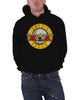 An official licensed men's cotton Pullover Hoodie featuring the Guns N' Roses 'Classic Pistol Band Logo' design motif. Classic unisex fit pullover style hoodie with pouch pockets. This high-quality hooded top is available in a black colourway. Size options include Small through XX-Large.