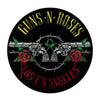 An official licensed Guns N' Roses Back Patch featuring the 'Los F'N Angeles' design motif. Designed to fit on the back of a jacket, add a super strip patch for the perfect combo. This is a sew-on printed 100% cotton panel with an overlocked edge. Thread is polyester. Four sided back patches measure approx. 30cm (top) 27cm (bottom) 36cm (height). Round back patches measure approx. 29cm diameter.