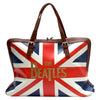 Statement tailored weekend bag featuring a bold Union Jack print adorned with a gold foil Beatles logo. Perfect for a weekend away or as hand luggage on your next holiday. Stylish pin buckle straps