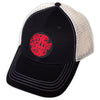 - High quality black & natural unisex mesh-back cap featuring embroidered front design motif with contrasting design details.